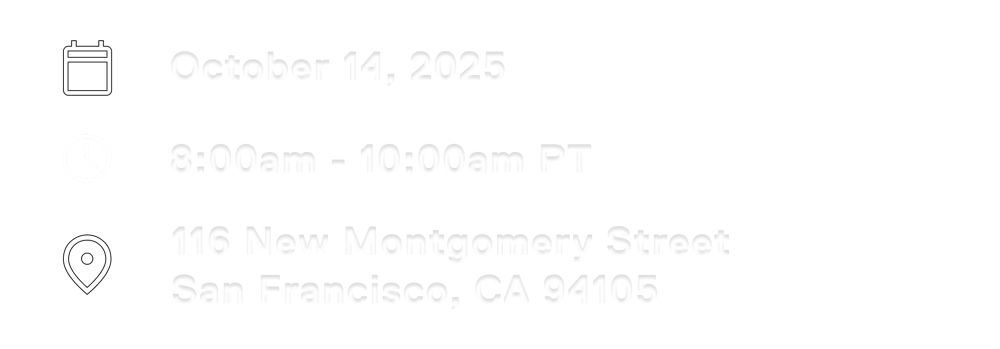 Please join us at 116 New Montgomery Street, which is a 15-minute walk to the Moscone Convention Center, where Dreamforce is held. The Caltrain rail station is a 10-minute walk. The 4th and Brannan Muni Metro light rail station is 8 8-minute walk. Surface street parking is available in multiple locations nearby for anyone driving into SF.